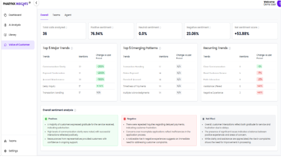At the team level, the VoC dashboard displays total calls analyzed, sentiment splits (positive, negative, neutral), and the Net Sentiment Score clearly indicating overall customer mood and experience quality.