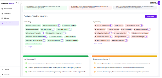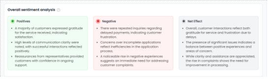 This section also represents agent achievement and improvement needed in different column along with positive and negative tags while also generating an overall sentiment analysis report.