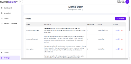 Pharynx Insights allows companies to create custom analysis formats through add filter to extract exactly the information they care about. Organizations can define custom tags or filters defining the weightages aligned to their priorities.