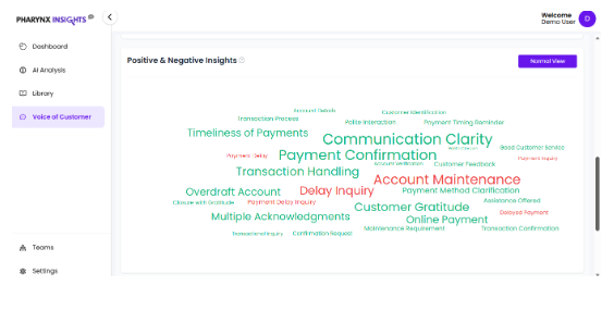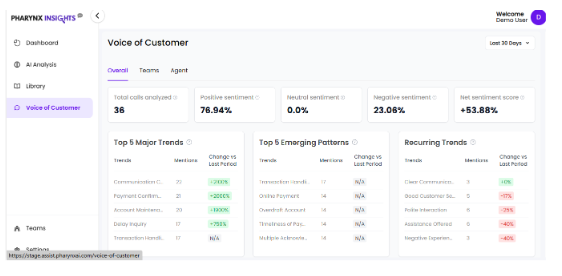 Pharynx Insights highlights the top five major trends based on frequent keywords and identifies emerging patterns validated by teams. This helps organizations detect recurring issues, improvement areas, and opportunities early.
